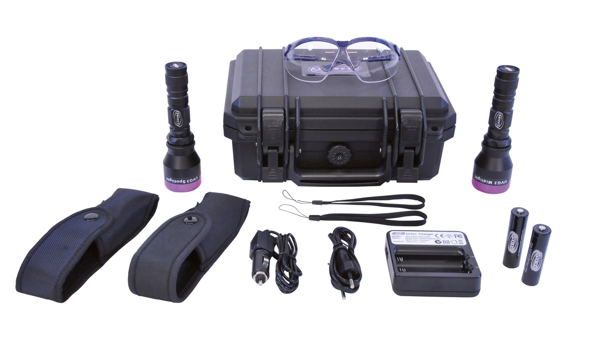 The Labino NOVA 2.0 Crime Investigation Kit features eight high-intensity LED lamps covering multiple wavelengths—including UV (365 nm), Purple (400 nm), Blue (455 nm), Cyan (505 nm), Green (530 nm), Amber (590 nm), Red (625 nm), and White light. This multi-wavelength forensic LED light kit enables detection of biological fluids, fingerprints, bruising, fibers, and other forensic evidence with precision. Manufactured in Sweden with serialised test reports for each lamp